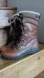 Dark brown rugged warm durable insulated puffer faux fur lined leather calf length boot. Six metal D-ring lace up closure with top metal eyelet. Puffer textile collar. Leather back calf pull tab. ‘Timberland’ debossed print logo on insole. Tonal ‘Timberland’ debossed logo on lateral side. Two-tone laces. Tonal stitching. Lace up. Comfort paired with warmth makes for a blissful boot-wearing experience. Finely woven heat-trapping fibres keep your feet warm, and an anti-fatigue footbed keeps your feet comfortable and energized for all-day snowshoing or hiking. A waterproof-breathable membrane blocks out cold and wet while still allowing moisture to escape. Recycled rubber outsole offers exceptional traction on a variety of terrain.