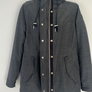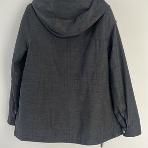 The jacket is two in one. The is an inner fleece zippered sweater for extra warmth which comes out. Great for hiking etc as you can bundle up and than cool down. Outer jacket has non removable hood