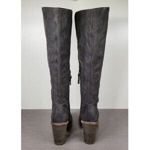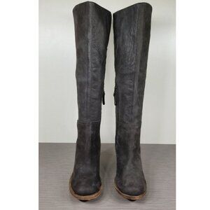 Premium full-grain leather with a hand-distressed finish enhances the rustic appeal of a downtown-chic tall boot set on a stacked block heel.
