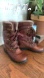 Dark brown rugged warm durable insulated puffer faux fur lined leather calf length boot.