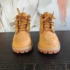 These Timberland boots feature a tan nubuck upper with a dark brown padded collar, offering a blend of durability and style. The traditional lacing system and chunky rubber lug sole ensure a secure fit and excellent traction, making them perfect for outdoor adventures.