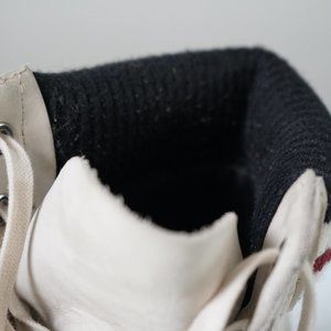 This is your chance to get your hands on a pair of special edition Timberlands that have been sold exclusively in Europe. Matt ivory leather and black/burgundy/off-white striped cuffs. It's a US 8.5 or European 39.5.