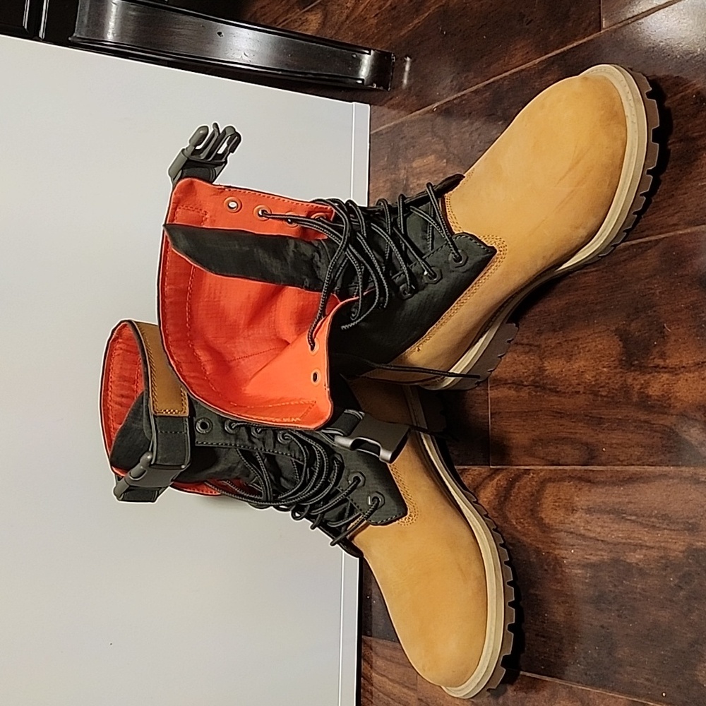 mens tan and army green timberlands. orange inside and they buckle at the top. excellent condition. men's size 7 I am womens 8-8.5 and they are too big.