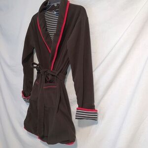 Super cosy fleece robe with fun, playful " Pirates" design on back edged with red trim. Front pockets with attached belt and cotton lined striped fabric.