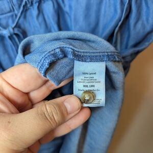 Stylish and casual Time & Tru denim-style dress in XXL (20W) Plus Size. Features a collared neckline, button-down front, chest flap pockets, elastic waist with drawstring, and sleeveless design. Lightweight and comfortable — perfect for spring and summer wear.