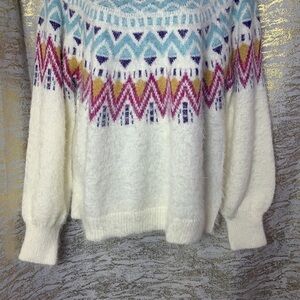 - Gorgeous white Pullover style sweater with raglan balloon sleeves, crewneck, side vents, relaxed fot, fair isle pattern - pink, gold, blue, purple, ivory, eyelash knit
