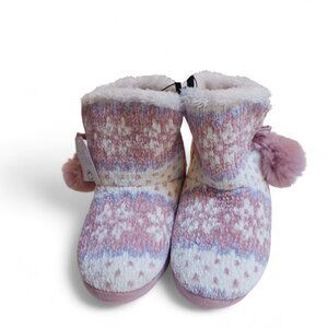 New with Tags! Soft and cozy Time & Tru bootie slippers in pink and white with cute faux fur pom poms. Fleece-lined for warmth and comfort. Size 5-6. Perfect for lounging or gifting 💡 Warm, comfy & adorable! 💡Greay Gift Idea💡