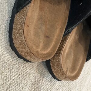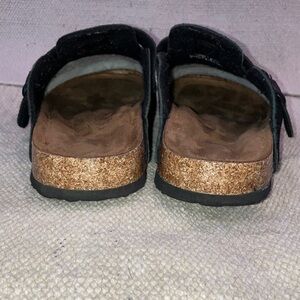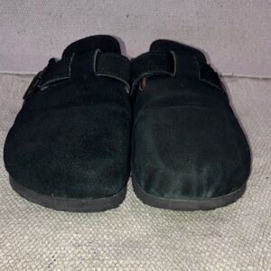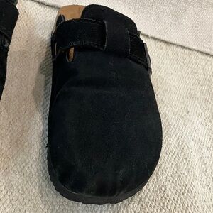 AI description: Stylish black suede slip-on sandals with a cozy footbed. Ideal for casual outings.