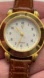 Timex watch with a gold toned case and brown leather band. Silver stainless steel back. Water resistant design. Bright Indiglo light for nighttime.