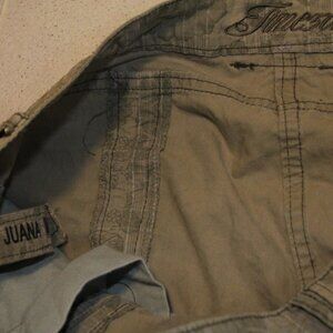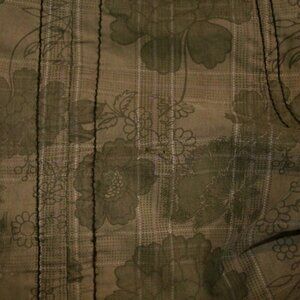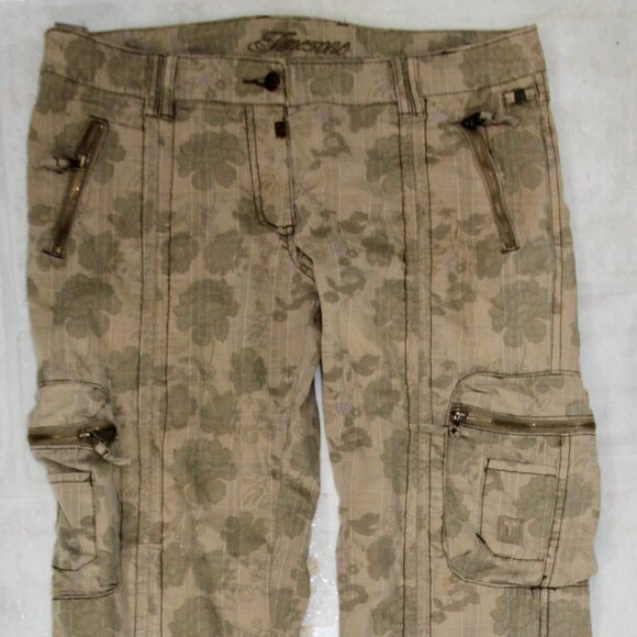 These Timezone brand cargo pants are made from a durable and breathable blend of 70% cotton and 30% polyamide, featuring brass buttons for a sturdy finish. They are in perfect condition except a small hole showing in one of the pictures. Their unique design showcases a greenish beige base with a combination of floral and plaid patterns, accented by pale pink flowers for a subtle yet distinctive touch. This rare and beautiful piece combines functionality with artistic style, making it a standout addition to any wardrobe.