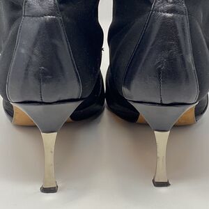 Ultra cool Timothy Hitsman calf length heel boots. A combination of black leather and black jersey/spandex plus futuristic metal 2.5” heel make these beauties sleek and stylish.