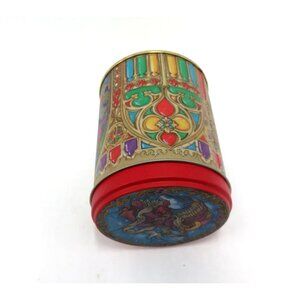 This metal tin container features a stained glass-inspired design, showcasing an angel and dove motif.