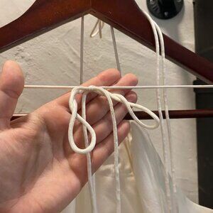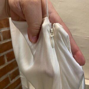 Designed to be cherished for generations, Keepsakes is an exclusive collection of exquisite heirloom dresses and gowns crafted in sumptuous silk and lace. Inspired by vintage piano shawls, the Tina cream silk satin maxi dress evokes the decadence and nostalgic style of the Italian Riviera. Featuring a high neck, a thigh-high slit, and an open-back cowl detail—this exquisite silk gown is finished with beautiful floral embroidery and fringe detailing at the side slit and hem, and has a fixed chiffon rosette at the neckline.