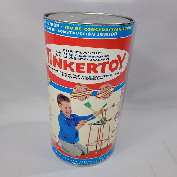 Tinker toy Classic Construction Set by Playskool. Missing only the manual, otherwise includes all parts which are unbroken. In the original can with lid, as shown.