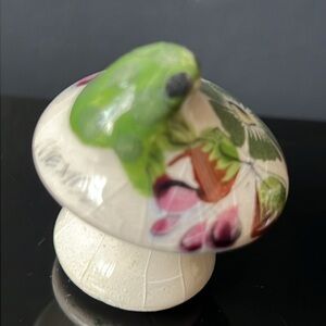 Adorable tiny frogs or toads on mushrooms, about an inch tall. Both are hand painted and marked Mexico. No chips or cracks but they do have quite visible crazing. See my closet for moree fun frogs, bundle and save!