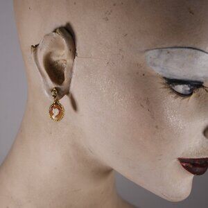 A set of teeny tiny cameo drop earrings, glues into gold toned frames and hung on clip-on backs. The cameos themselves look to have been hand carved from shell. The backs and earrings clips are a gold toned metal, the clips are marked " Patented" and there is what looks like a makers mark on the back but it´s near impossible to make out. The only thing it looks like to me is the mark for Little Nemo jewellery, but I may be wrong.