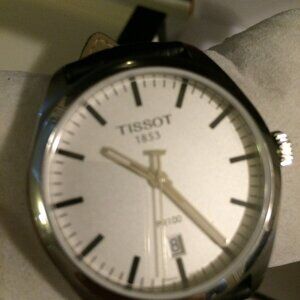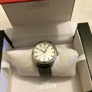 Tissot PR 100 Quartz with genuine leather strap in new, unused condition. Features scratch resistant sapphire crystal and a very wearable 39mm case size. Lug width is 20mm. The band width is 20mm and tapers down to 18mm at the closure. It is a beautiful timepiece, economical to maintain at a very affordable price given the quality and finish of this iconic brand. Great for either dressy or less formal occasions. It should be noted that the outer sleeve of the watch box has a tear in the corner. (please see photo), The watch itself is in excellent condition. Swiss-made.