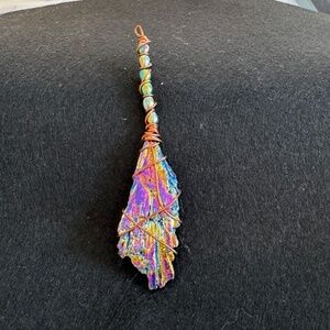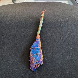 The Titanium Aura Kyanite Witch Broom is a unique combination of stunning aesthetics and metaphysical properties. Featuring titanium aura-coated kyanite bristles, this piece is both eye-catching and symbolic. Perfect for display or ritual use, it embodies a blend of modern and mystical charm.