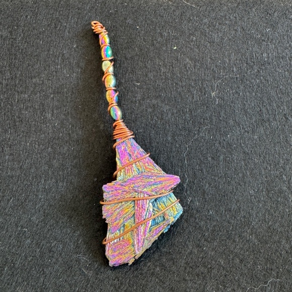 The Titanium Aura Kyanite Witch Broom is a unique handcrafted piece designed for those who embrace spiritual practices. Featuring a striking crystal design, it combines the energy properties of kyanite with the iridescent sheen of titanium aura for enhanced metaphysical benefits. Perfect for rituals, meditation, or as a decorative statement, this broom is both functional and visually captivating.