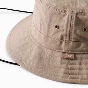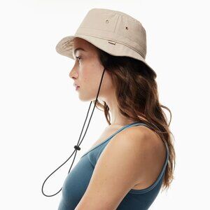 This is a bucket hat with an interior mesh sweatband, embroidered eyelets and a cinchable drawcord. It’s made with water-repellent recycled nylon that’s been tested to withstand both salt and chlorinated water.
