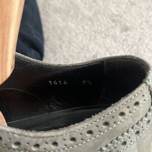 A beautiful and sturdy pair of suede leather wingtips. These shoes have been walked on, but you wouldn’t know it unless you’d you looked at the soles. The leatherr has very minimal creasing and no scuffs at all. The soles themselves still have plenty of tread left as well. Between the excellent styling and design and the muted stone grey colour, this pair would look excellent all seasons with almost all outfits