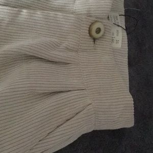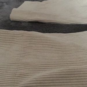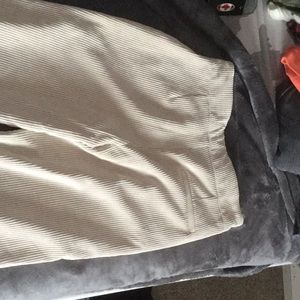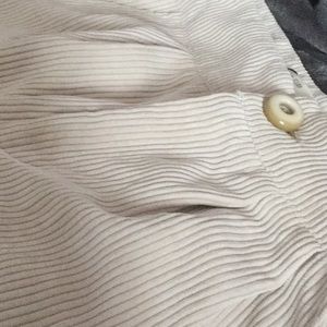 Corduroy, beige, very comfy, has pockets ( front and back) , and a cute button for clasping.