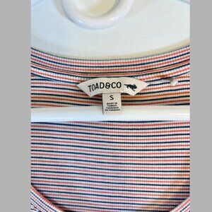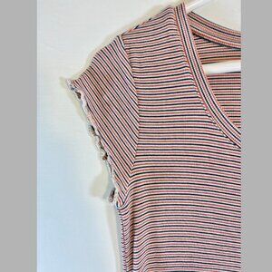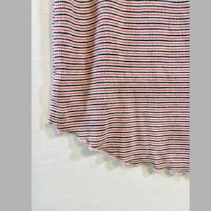 Red, white stripe print, super soft material with stretch, scalloped hem, flattering fit, armpit to armpit 16”, shoulder to hem 24.5”