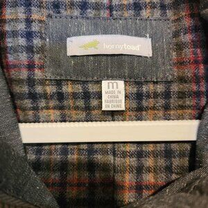 This is a lovely fall coat, in a great greenish/grey colour that is so flattering by Toad and Co/Horny Toad. Plaid flannel lining is extra cozy. Great pockets in front and it's very flattering. Drawstring at waist. Chest 18" across, length approx 33". Size Medium. Would fit sz 6-8.