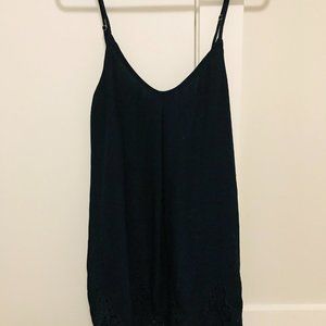 Navy Tobi spaghetti strap dress with beautiful detailing on the bottom. Adjustable straps. Great for summer, or can layer with a turtleneck underneath with tights for Fall or Winter!