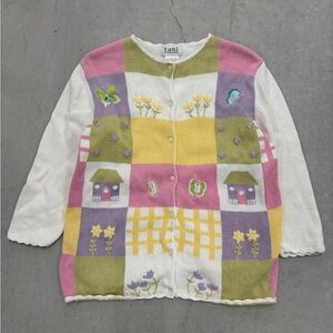 Add a splash of color to your wardrobe with this Tobi patchwork cardigan. Featuring a delightful mix of pink, yellow, and green, it's adorned with charming floral and butterfly designs.
