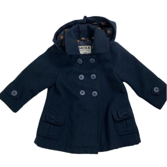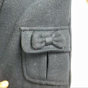 Super cute coat with pocket that have little bows on them. zippered closure that also gets reinforced with buttons. Hood is removable.