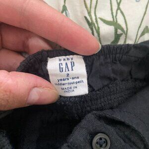 Size 2T (runs a bit small). Black cotton jumper with stretchy elastic back from baby Gap. Like new, only worn a few times.