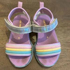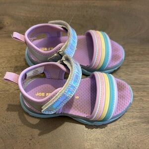 Colorful kids sandals with a rainbow design, perfect for playful days. Light up when walking! Size 6C Joe Fresh