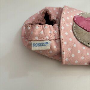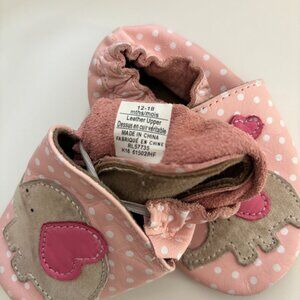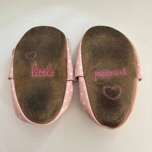 The Robeez Little Peanut Soft Soles are pink baby shoes with a white polka-dot leather upper with a soft, suede sole and inner lining. These pink toddler shoes feature a mother and baby elephant on each foot playing a game of “Follow The Leader” and are sure to become a favourite in your toddler’s closet. Adorable details of these shoes include leather appliquéd ears shaped like hearts and "Little Peanut" embroidered on the sole in pink thread.