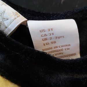 3T sized. Black velvet and yellow striped bumblebee costume with snap crotch body suit and tulle under skirt. Complete with wings and bobbles ears on a headband. Super cute.