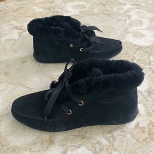 In excellent preowned condition Tod’s Gommino black suede & shearling moccasin style ankle driving booties.