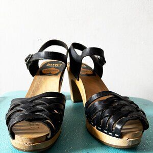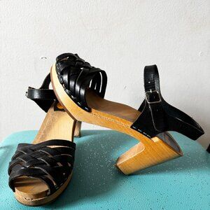 Classic clogs with black leather criss-cross upper and ankle strap. Lightly worn, with a few scuffs to the wooden heels (can be sanded out). Selling as they are 1 size too small for me! Genuine Swedish Hasbeens purchased new - this style is no longer available! Euro size 37, U.S. size 7. Heel height is 9 cm / 3.5 in. Surprisingly comfortable for wooden heels!