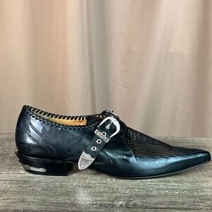 The Western Mesh Loafer in black by Toga Pulla. Featuring a pointed toe, a mesh upper, silver-tone hardware, stitching details, a leather insole and a low heel. This item is true to fit.
