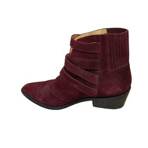 Toga Pulla Suede Embroidered Western Bootie. Suede effect, solid colour, elasticised gores, narrow toeline, square heel, leather lining, leather sole, contains non-textile parts of animal origin, strap detailing. Colour on website is "deep purple" I'd say it's between a purple and a red. Size 38, gently worn.