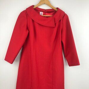 Stunning red dress by Tom and Linda Platt. Large asymmetrical collar frames face with 3/4 length sleeves. Fully lined interior. Back zip with hook and eye closure.