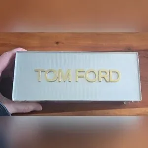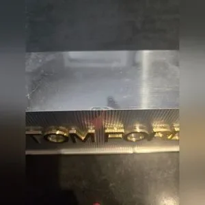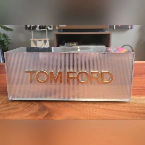A unique hard to find Tom Ford advertising block used in stores! The front features clear corrugated background with gold raised lettering, and sides are shiny metal. Has a nice weight to it (1lb 10.5oz)- measurements are approx 8 inches wide, by 3 inches tall and 2.5 inches deep. Considerable scratches on all metal sides - can possibly be buffed out - would be unnoticeable if placed on a shelf as front is in good condition. Would be amazing as a shelf piece alongside your favorite Tom Ford items!!