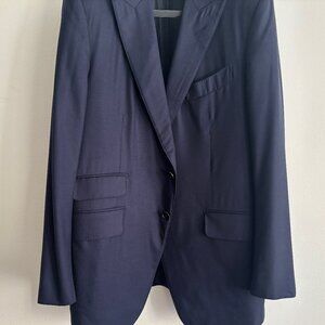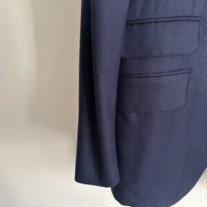 The jacket has a peak lapel, features flap pockets as well as a ticket pocket at the waist and has two vents. The fabric is a dark navy wool. Fully canvassed. Features surgeon's cuffs (working buttonholes). Made in Italy.