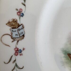 The plate shows Tom Kitten and mother in the centre with small images of Two Bad Mice and Squirrel Nutkin on the sides.