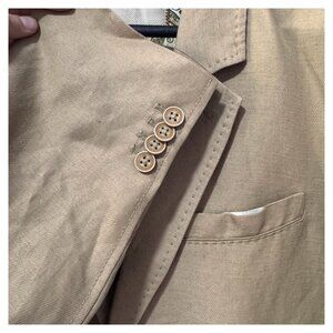 Pit to pit 24" Length 32" Crafted for the man who appreciates both comfort and style, this Tommy Bahama blazer is a standout piece in a relaxed yet sophisticated tan hue. The Island Zone designation hints at an effortless island vibe, perfect for versatile wardrobe integration. In a large size, it caters to the regular build with ease.The blazer is constructed from a premium linen blend, ensuring breathability and durability. It features a timeless design that seamlessly blends with the modern man's lifestyle. Ideal for various occasions, from casual outings to more formal events, this jacket embodies the effortless elegance synonymous with the Tommy Bahama brand.