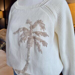 Tommy Bahama Breezy Palm sweater, cream knit with embroidered chenille tan palm tree. Size XS. Crew neck, 60% cotton 40% viscose sweater, chenille is 100% polyester. Excellent like new condition. Bust measures 19.5 inches laying flat, length from shoulder to hem is 21 inches. Cat friendly, nonsmoking home.