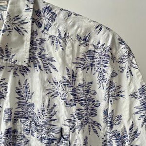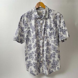 Gorgeous lightweight cotton shirt in soft white with a blue and purple floral/leaf motif. Faux wood buttons. This shirt looks amazing with jeans, chinos or shorts. Perfect for summer parties, drinks on the patio, lounging by the pool or anywhere else that brings the summer fun!