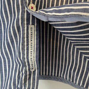 Details: Button-down collar, chest pocket, contrast trim, hem detail tag “Make Life One Long Weekend”