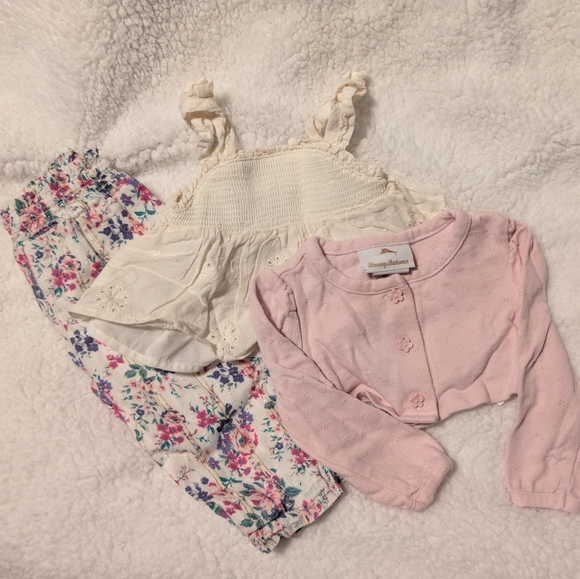 Three-Piece Tommy Bahama baby set. Floral pants are light and airy and the tank top is so cute. Tank has stretch to it for chunky little babies and the sweet little cardigan just as the perfect touch. Worn once and washed and tide free and clear.