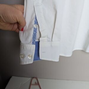 Classic Tommy Bahama men's white button-down shirt with a blue accent logo on the pocket. Lightweight and breathable, though the fabric tag is missing, it feels like cotton.