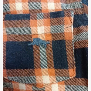 Orange, navy and white plaid pattern, this adorable long sleeved top is a button up. The shirt has a chest pocket and the cuffs can be rolled up and buttoned.